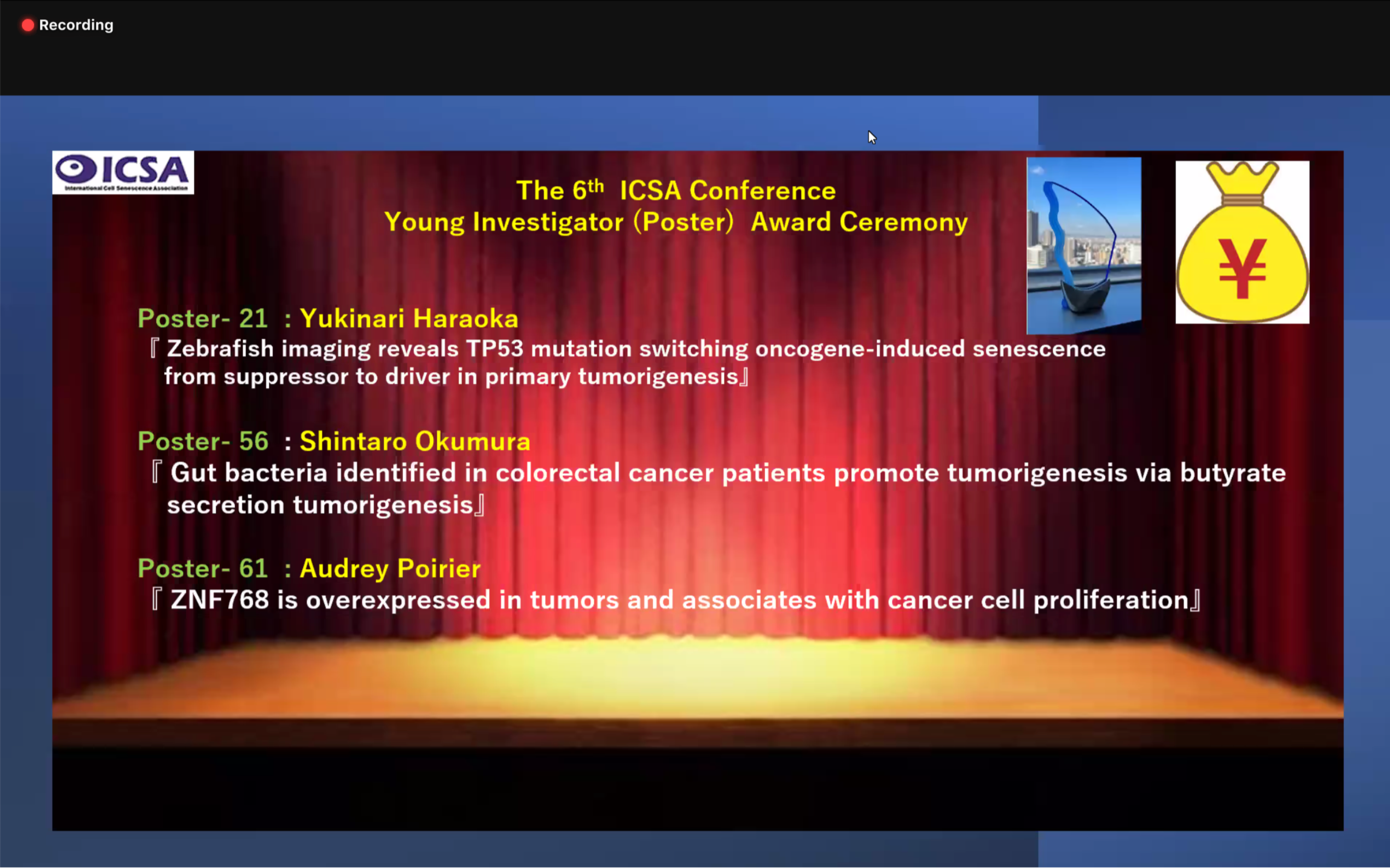 12/12-15: International Cell Senescence Association 2020 Conference (ICSA2020) にてD4の小神野くんがキリフィッシュ細胞老化について、D3の原岡くんが細胞競合と細胞老化についてポスター発表しました。原岡くんがyoung investigator awardを受賞しました!!